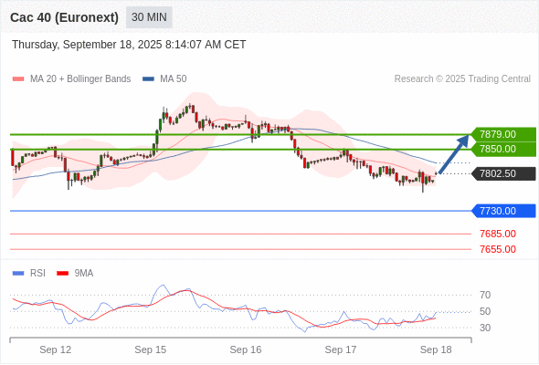 法国CAC指数期货 (Euronext) (U5) 当日内: 超短线(当日内)支撑位在7730.00附近。