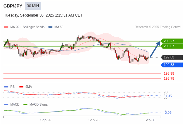 英镑/日元 当日内 : 有上涨的可能,目标价位定在 200.27 。