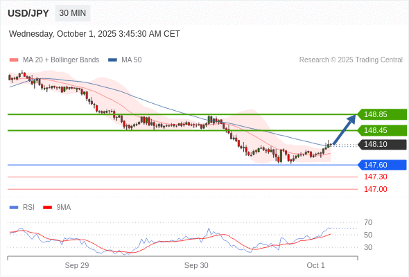 在 147.60 之上,看涨,目标价位为 148.45 ,然后为 148.85 。