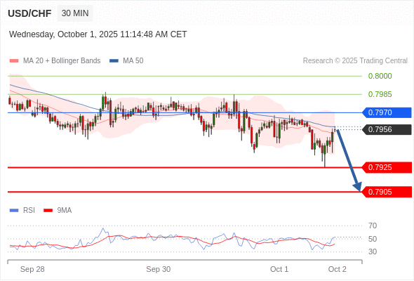 在 0.7970 之下,看跌,目标价位为 0.7925 ,然后为 0.7905 。