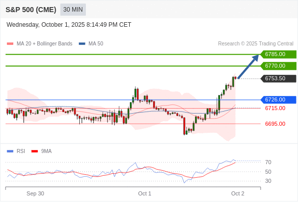 交易策略: 在 6726.00 之上,看涨,目标价位为 6770.00 ,然后为 6785.00 。