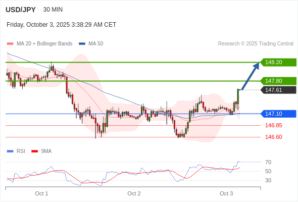 在 147.10 之上,看涨,目标价位为 147.80 ,然后为 148.20 。