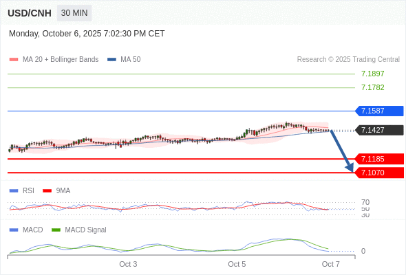 当 7.1587 维持阻力位时,看跌,目标锁定在 7.1070 。