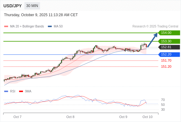 在 152.20 之上,看涨,目标价位为 153.30 ,然后为 154.00 。
