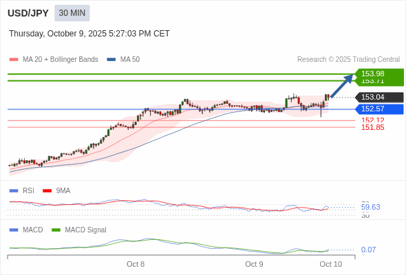 美元/日元 当日内 : 看涨,当 152.57 为支撑位。