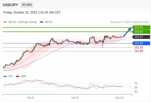 在 152.55 之上,看涨,目标价位为 153.50 ,然后为 153.85 。