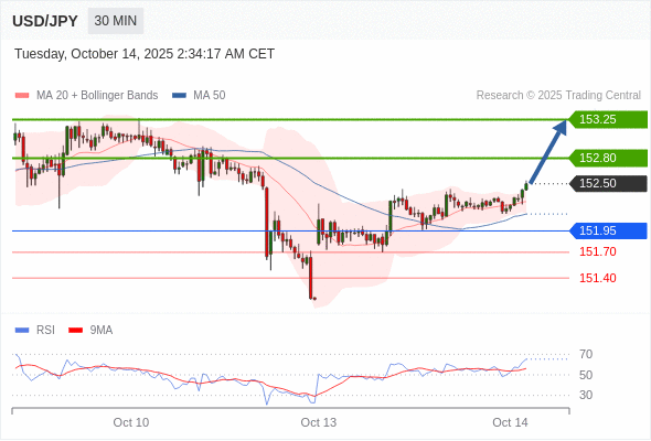 在 151.95 之上,看涨,目标价位为 152.80 ,然后为 153.25 。