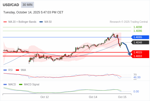 美元/加元 当日内 : 逐渐下跌,当 1.4065 阻碍上行,则 1.4003 为目标位。