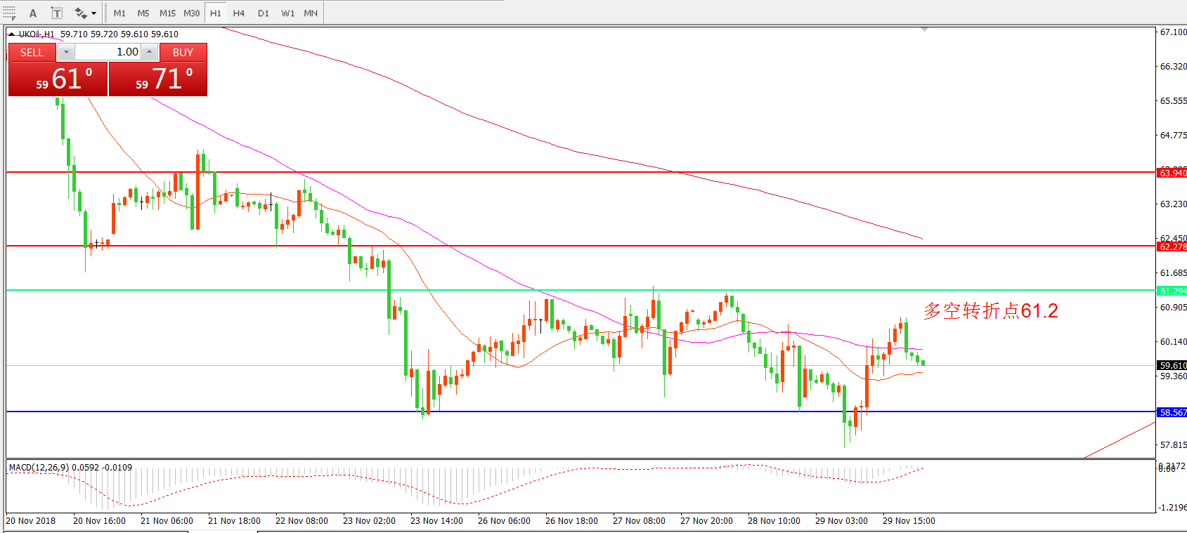 交易策略:在61.2之下看跌,目标58.00    56.50