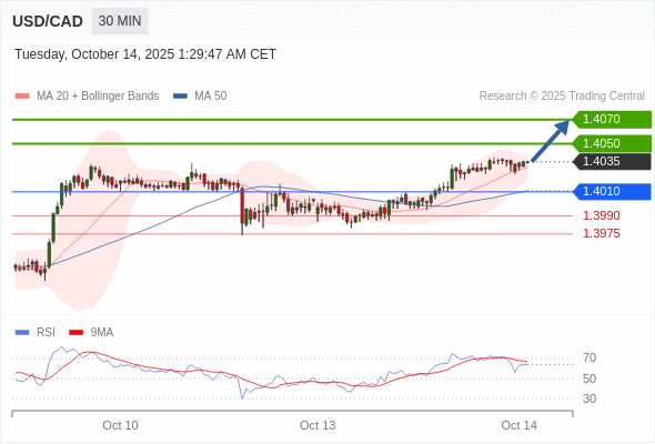 在 1.4010 之上,看涨,目标价位为 1.4050 ,然后为 1.4070 。